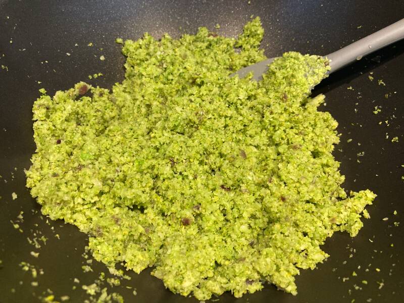 - Draai de broccoli tot deze ongeveer de maat van een rijstkorrels heeft. Als de roosjes te groot zijn, kan het soms gebeuren dat deze niet goed door de foodprocessor vermalen worden.