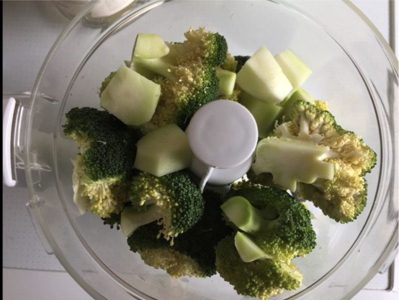 - Was de broccoli en snij deze in kleine roosjes. De steel kun je ook gebruiken, verwijder de buitenste laag, t/m de draden aan de binnenkant. Voeg daarna alles in de foodprocessor.