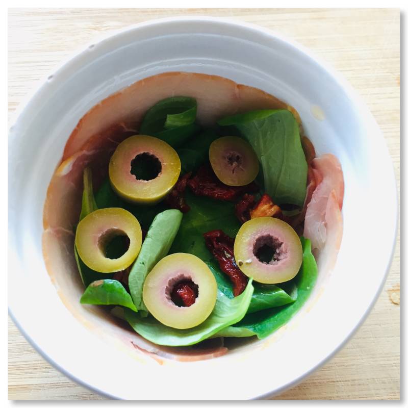 - Daarbovenop leg ik de veldsla of ander lekkere restjes die ik heb, tomaatjes en olijven, uiteraard kun je ook kiezen voor je eigen lekkere vulling, niks is te gek!