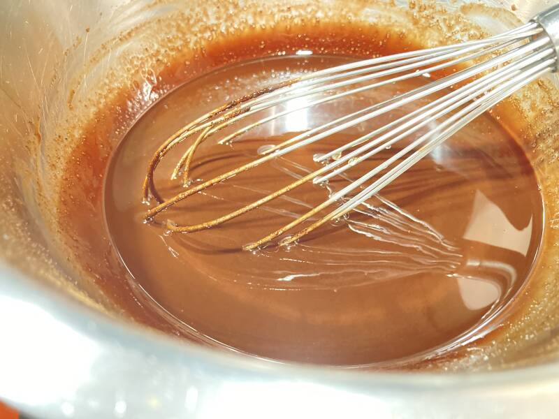 - Voeg de cacao en honing (of agave) toe aan de gesmolten kokoksolie en mix met een garde tot het opgelost is. Mocht het iets te dik zijn, kan je de mengkom nog even au bain-marie verwarmen.