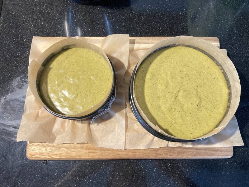 - Giet het pistachemengsel in de springvorm en zet minimaal 6 uur in de vriezer om goed op te stijven.