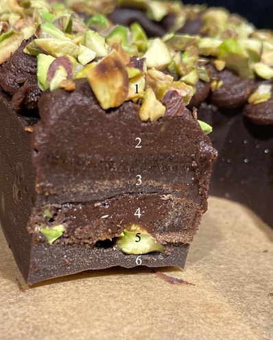 Deze letters zijn gemaakt van pure, onbewerkte cacao wat een heerlijke donkere smaak geeft. Ik heb de letters gevuld met een chocolade-dadelmousse en stukjes gebrande pistachenoot met licht zoutige smaak op de achtergrond.