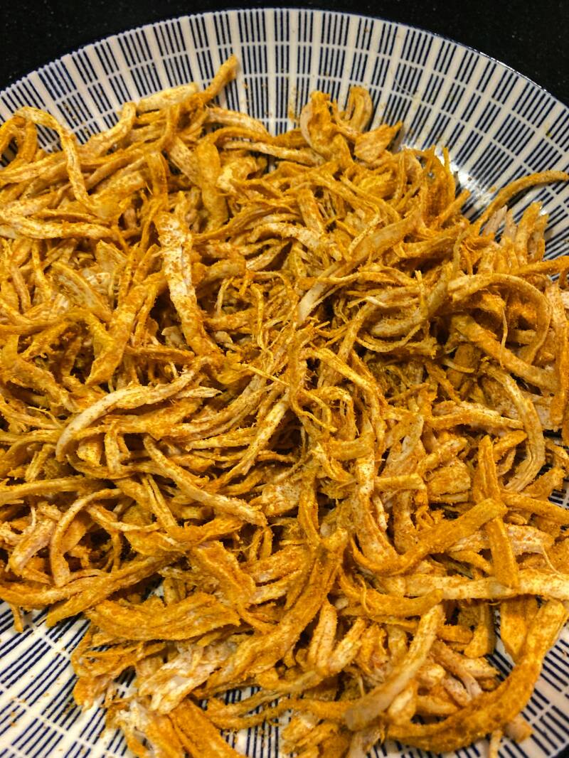 - Voeg de afgekoelde pulled chicken toe en meng goed door elkaar.