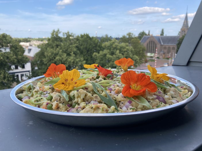 - Indien je tuinerwtjes in je salade wilt (deze geven een licht zoetje aan de salade), is het aan te raden om die net als de aardappelen vooraf te koken, vanwege het proces van resistent zetmeel. Breng ruim water aan de kook en blancheer de tuinerwtjes hierin voor 2 minuten, giet af maar spoel niet af! Laat ze net als de aardappelen langzaam afkoelen.