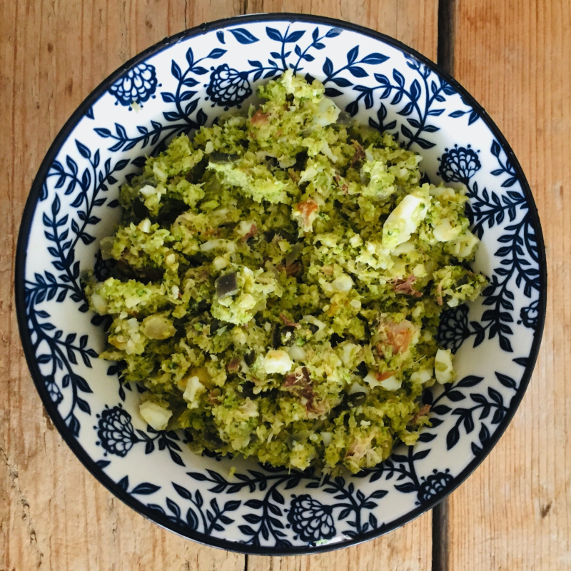 Op het moment dat ik het recept wilde gaan maken, of een variant ervan, had ik een restje broccolirijst in de koelkast staan van de dag ervoor. Ik maakte wel vaker een eiersalade met daarin broccolirijst of bloemkoolrijst en die combi kende ik heel goed! Dus totaal op gevoel zoals het bij mijn koken vaak gaat, besloot ik de broccolirijst toe te voegen. Dat was een geweldige toevoeging, aan de al zo mooie ingrediënten in de salade.