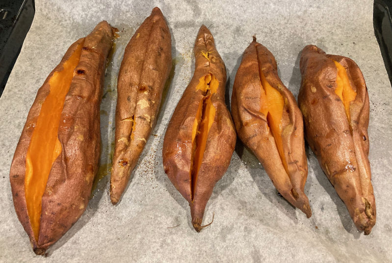 - Was de zoete aardappel, prik gaatjes in de schil en pof deze in de oven op 190 ºC voor ongeveer 45 minuten tot ze zacht zijn geworden. Snij daarna open, lepel uit en draai in de foodprocessor tot een gladde puree. Voeg zout toe naar smaak en vul daarna een spuitzak met deze puree.