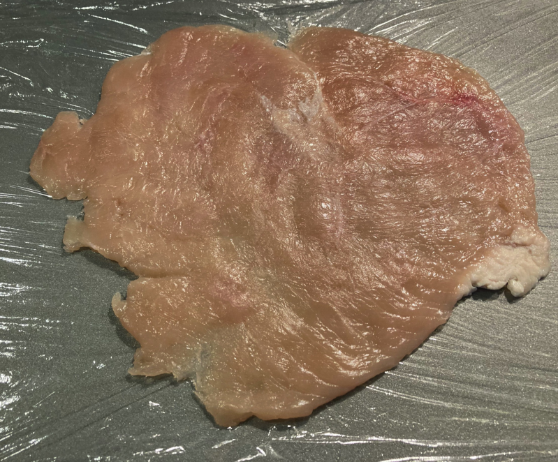 - Leg op de snijplank een laag huishoudfolie en daarop de drooggedepte kipfilet. Daaroverheen een tweede laag huishoudfolie, zodat de kip tussen twee lagen in ligt.